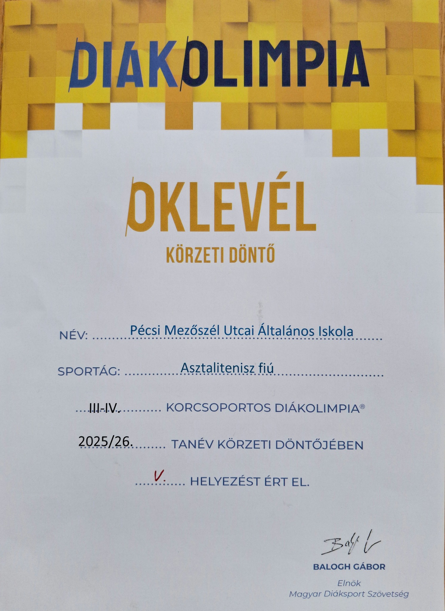 A pécsi és Pécs környéki iskolák részvételével lezajlott asztalitenisz diákolimpián iskolánk csapata 5.helyezést ért el.