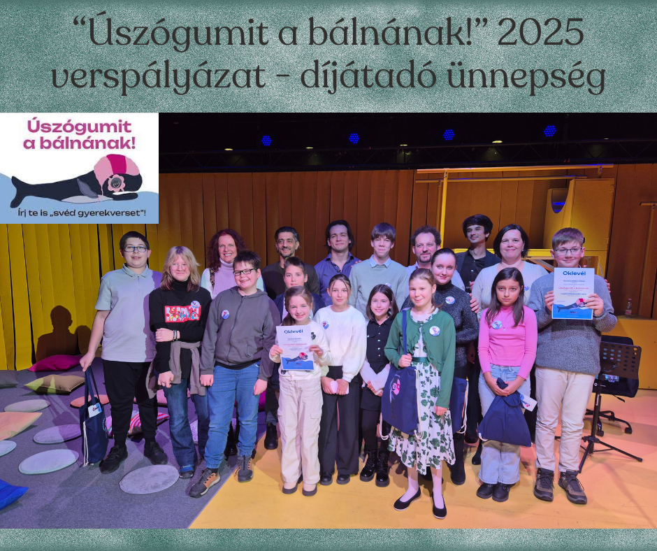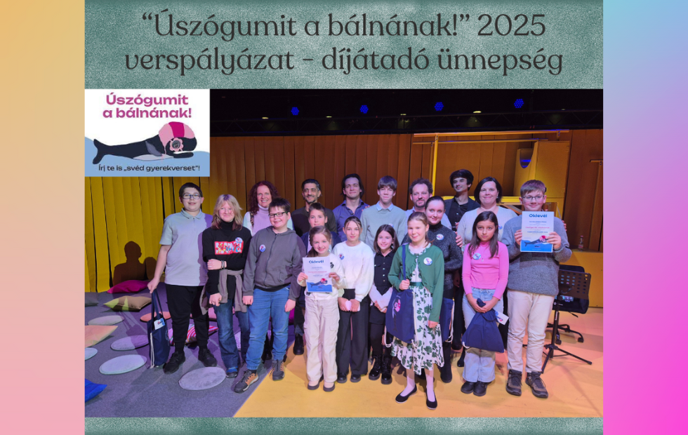 November 29-én, szombaton a Mezőszép Irodalmi Alkotóműhely tagjai a Budaörsi Jókai Mór Művelődési Központban jártak, az „Úszógumit a bálnának!” című svéd gyermekversíró pályázat díjátadó gáláján. A háromtagú zsűri – melynek elnöke Varró Dániel volt – 6 tanulónk verseit is kiemelte a 114 beérkezett pályamű közül.