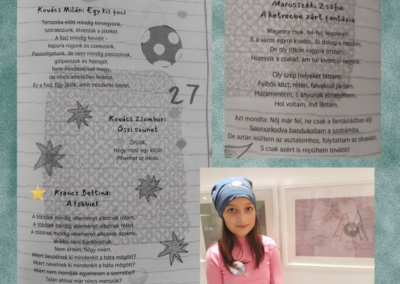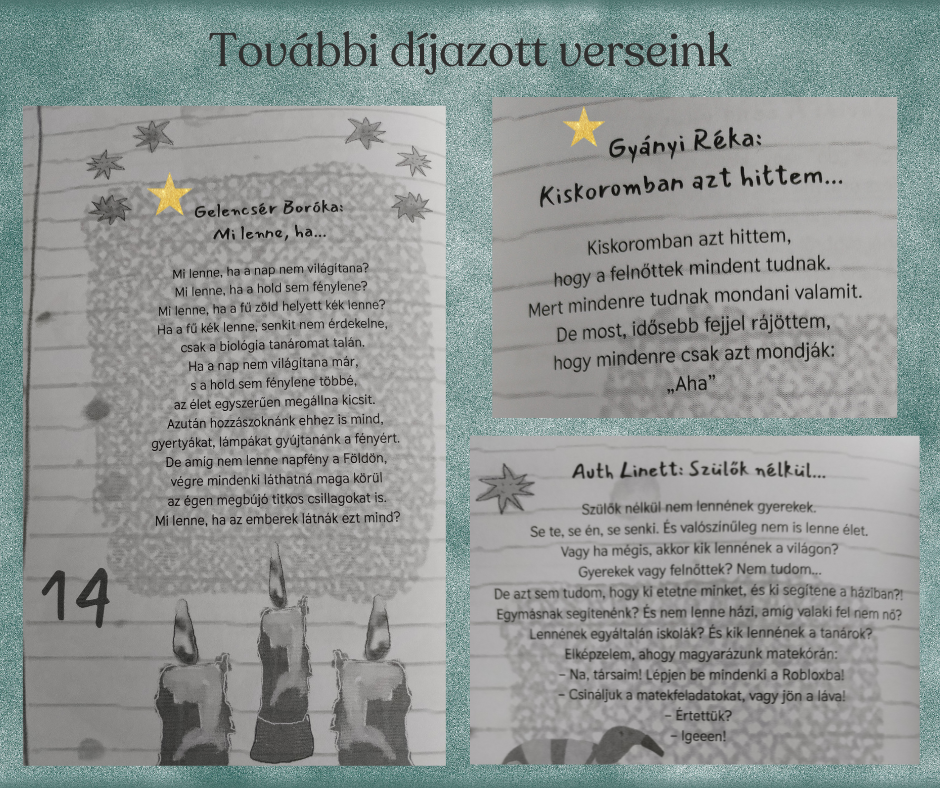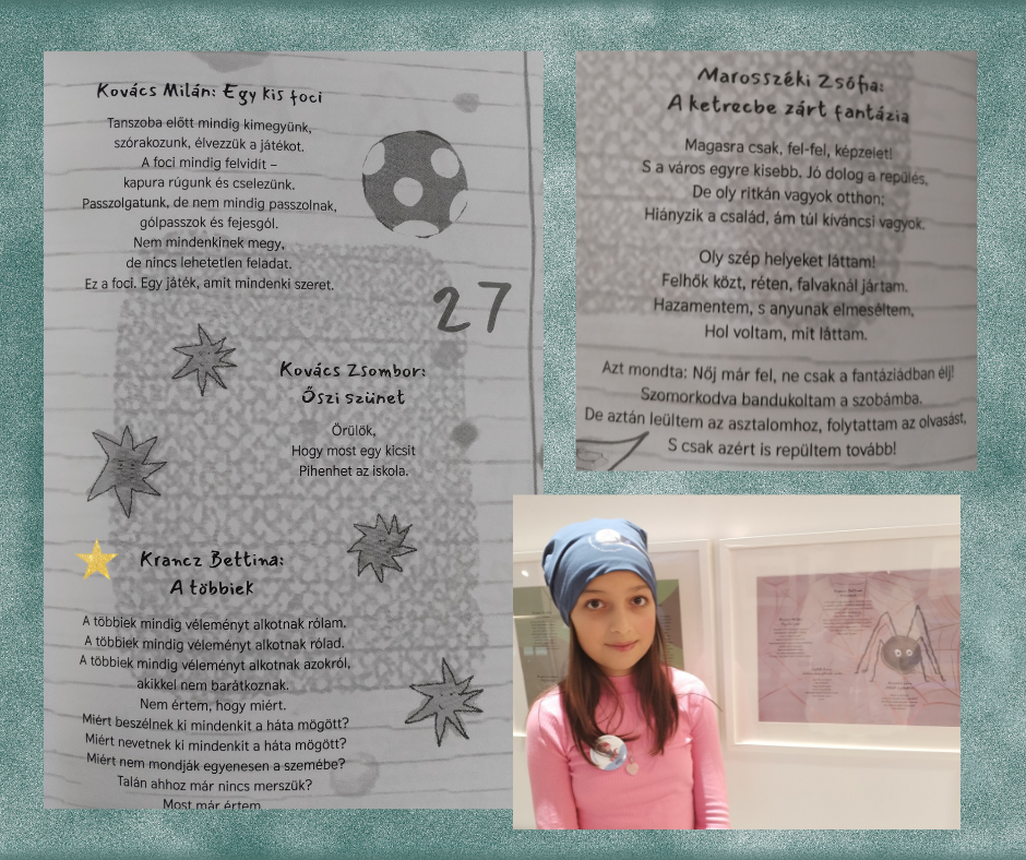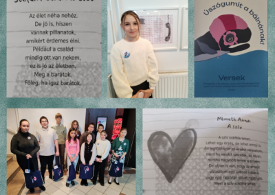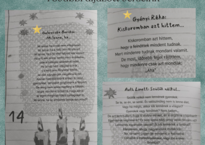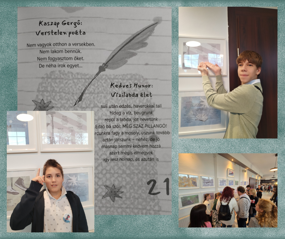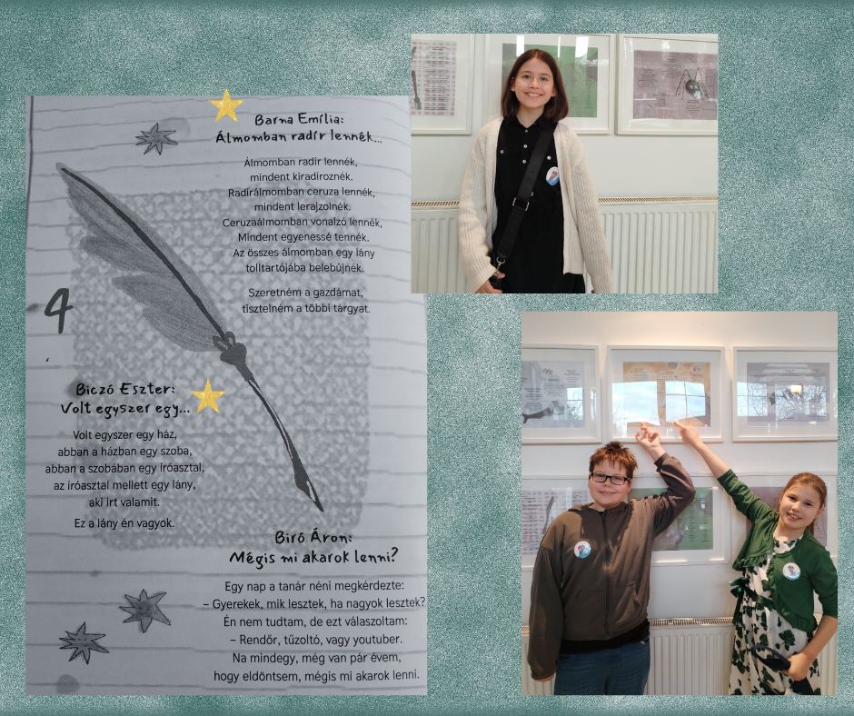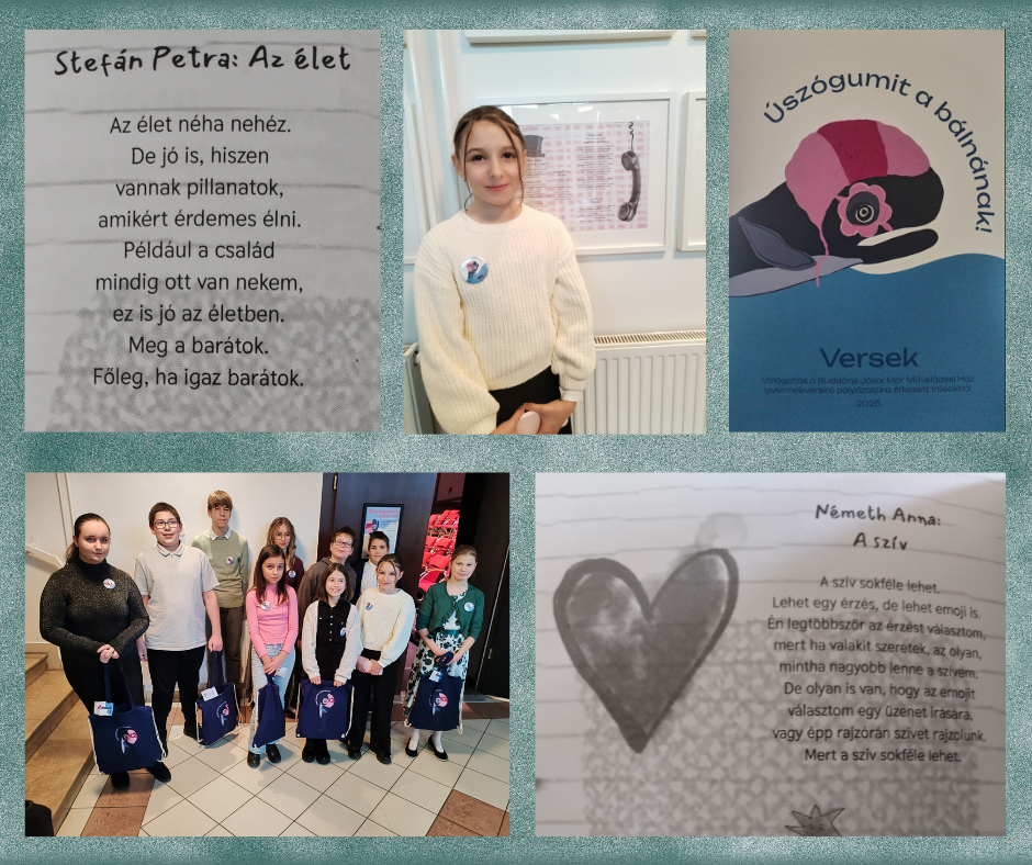 Minden pályázó tanulónk verse kiállításra került a művelődési központban, illetve nyomtatott antológiában kapott helyet. A gyerekek műveit a Budaörsi Latinovits Színház színművészei szavalták el.