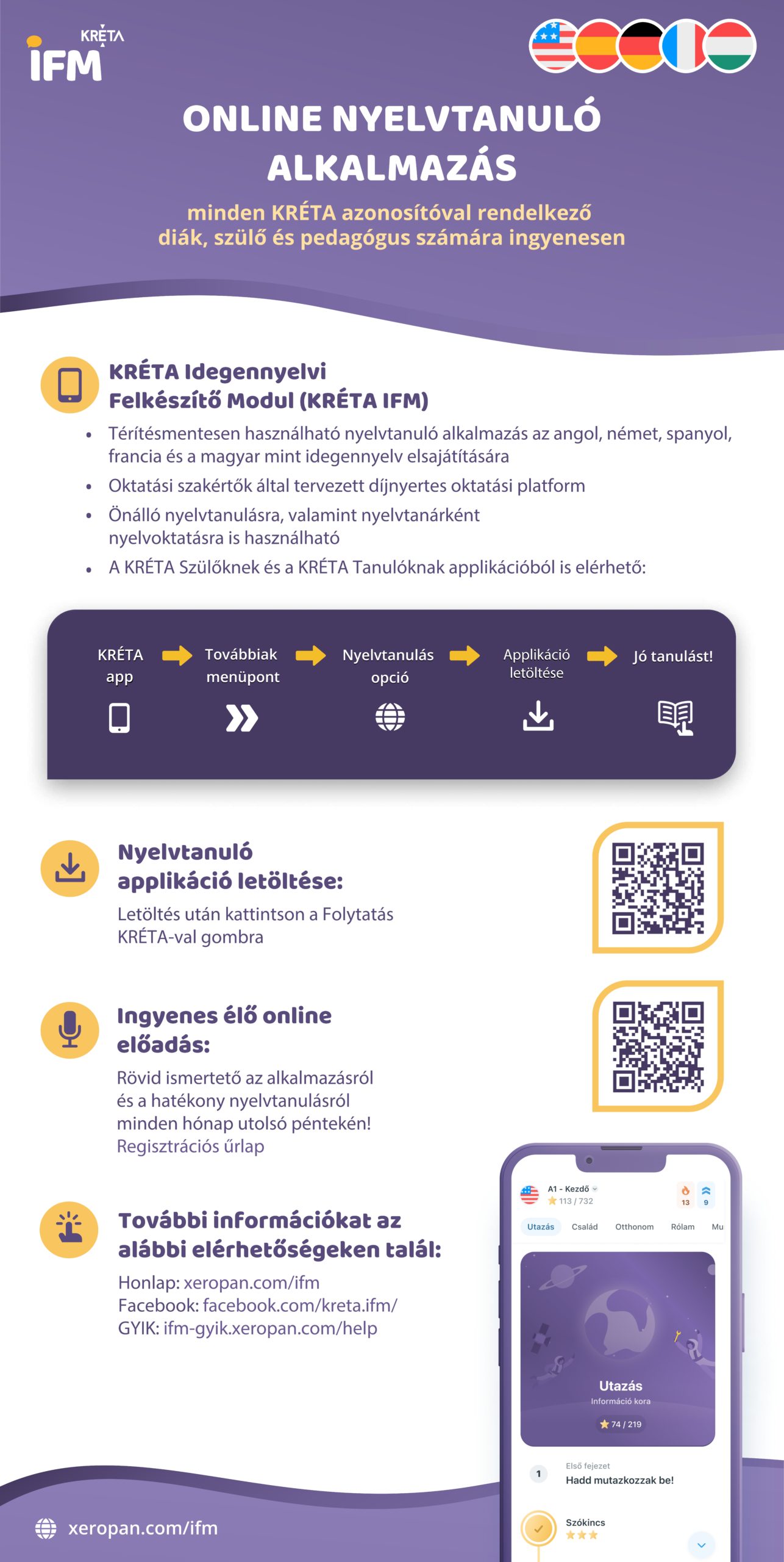 Ezúton szeretnénk felhívni figyelmüket arra az egyedülálló, innovatív és térítésmentes nyelvtanulási lehetőségre, amelyet a KRÉTA Idegennyelvi Felkészítő Modul nyújthat a gyermekeik számára. A szülők részére készített online információs anyagot és videót az alábbi linken keresztül elérhetik:
